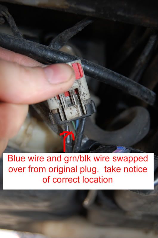 *Start by taking your fuel pump connector, removing the blue retaining plug, gently prying on the grey prongs and remove the two middle wires(blue wire and grn/blk wire). After doing that put the blue retaining plug back in.